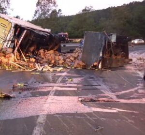 Caminhões tombam um em cima do outro em curva na BR-376, no Paraná