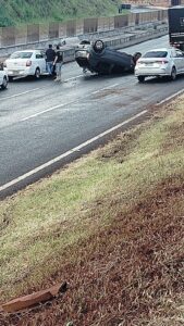 Um carro acabou capotando após bater em um barranco na BR-376, em Mandaguaçu. O acidente aconteceu no final da tarde desta quinta-feira, (16).