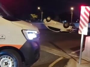 Um carro capotou após se envolver em uma colisão na Avenida Kakogawa, cruzamento com a Rua Rodolfo Creem, em cima do viaduto do Contorno Norte, em Maringá. O acidente aconteceu na noite desta quinta-feira (02).