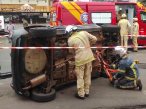 HOMEM FICA PRESO DENTRO DE CARRO TOMBADO APÓS ACIDENTE E É RESGATADO PELOS BOMBEIROS EM MARINGÁ