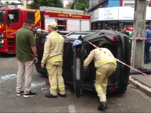 Um homem acabou ficando preso dentro de um carro tombado e precisou ser resgatado pelo Corpo de Bombeiros após um acidente no cruzamento da Rua Brasílio Saltchuk, com a Av. Tamandaré, no centro de Maringá. O caso foi registrado na manhã desta sexta-feira (23).
