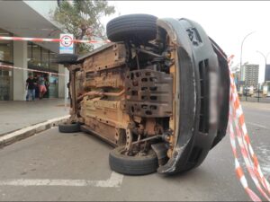 Um outro veículo se envolveu no acidente, o motorista não ficou ferido. Pelos relatos de testemunhas, um dos carros teria furado a preferencial e houve a colisão no cruzamento terminando com Celta tombado. Uma equipe da Polícia Militar esteve no local registrando o boletim de ocorrência.