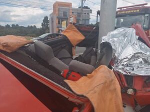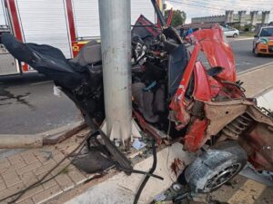 Um carro do modelo Passat praticamente “abraço um poste” após um acidente violento na Rodovia da Uva, PR-417, em Colombo, Região Metropolitana de Curitiba. Foi na tarde deste domingo (06). O carro era ocupado por duas pessoas, uma das vítimas foi socorrida em estado grave, já a outra acabou não resistindo e morreu.
