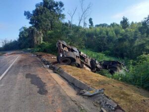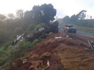 Motorista de 41 anos morre em grave acidente envolvendo caminhão que transportava óleo vegetal na BR-376 em Imbaú-PR.