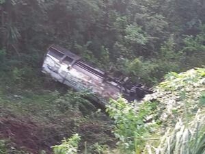 No local constatado que um bi trem de transporte vegetal deslocava sentido Ponta Grossa quando atravessou a pista contrária, saindo de pista e caindo pelo barranco.