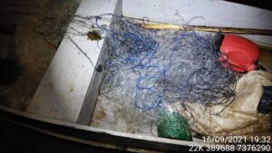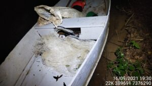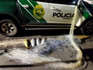Na tarde de ontem, a equipe realizava patrulhamento aquático no rio Ivaí, município de Itambé, quando receberam a informação de que havia pescadores com redes em uma corredeira abaixo da localidade conhecida como Celestino. Ao aproximar-se do local a equipe viu dois homens em um barco de madeira com redes e tarrafas e ao realizarem a abordagem um dos pescadores pulou do barco e fugiu nadando rio abaixo. Dentro do bote foram encontrados 100 metros de redes de emalhar, 01 tarrafa, 03 peixes da espécie curimbatás e 01 peixe da espécie dourado, o qual está proibido para captura. O homem abordado foi autuado em flagrante na delegacia de polícia de Marialva e recebeu multas no valor total de 3.720 reais por pescar mediante a utilização de petrechos de uso proibido e capturar espécie proibida por lei. O pescador que fugiu foi identificado pois deixou para trás uma motocicleta registrada em seu nome e também será autuado e responderá criminalmente pelo fato.