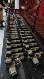 Em um dos caminhões foram localizadas 93 armas de fogo, sendo 69 pistolas, 3 fuzis e 21 espingardas calibre GA12, sendo que uma destas pistolas estava municiada e carregada para uso pessoal.