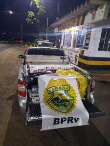 Durante operação de fiscalização defronte ao PPRv de Colorado a equipe deu ordem de parada ao veículo Gm/Montana com placas de Paraguaçu Paulista/SP, a qual era conduzida por R.S.L. de 50 anos, masculino. Durante revista no veículo fora constatado que no compartimento de bagagem (caçamba) o mesmo transportava várias caixas de cigarros contrabandeados do Paraguai. Foram contabilizadas 818 (oitocentos e dezoito) pacotes de cigarros de diversas marcas. O condutor foi encaminhado para à Delegacia de Polícia Federal para lavratura do flagrante, sendo o veículo lacrado e encaminhado ao depósito da Receita Federal de Maringá para as demais providências.