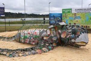 “Exposição ficará no Parque das Águas e visitantes poderão descartar garrafas pets dentro do casco da tartaruga”.