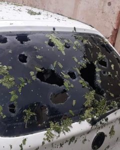 Telhados foram completamente destruídos pela chuva de granizo, além de vidros de carros e acúmulo de pedras de gelo no chão. Ainda a