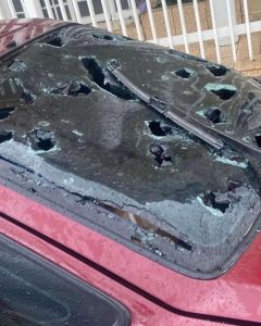 Telhados foram completamente destruídos pela chuva de granizo, além de vidros de carros e acúmulo de pedras de gelo no chão. Ainda a