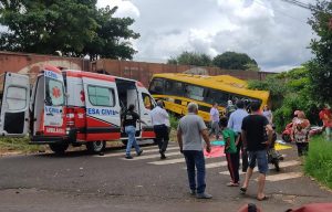 Um ônibus de transporte escolar foi atingido por uma locomotiva. O veículo teria atravessado a linha ferrea, não deu tempo de passar onde o trem bateu com muita violência na lateral do ônibus. No coletivo havia crianças.