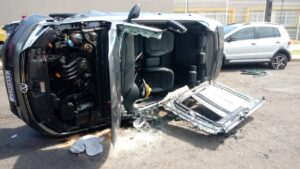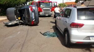 Foi uma colisão envolvendo dois veículos, um deles tombou com o forte impacto.